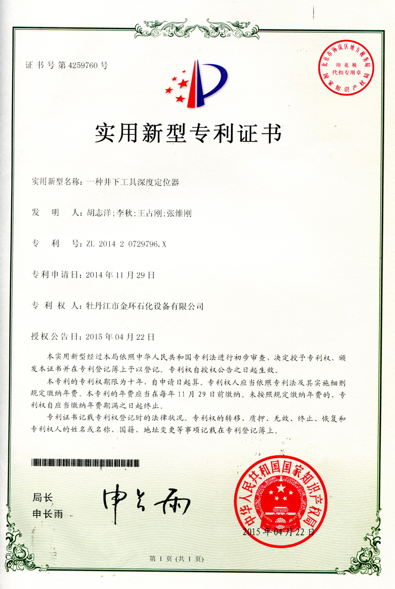 一種井下工具深度定位器實(shí)用新型專利證書ZL 2014 2 0729796.X