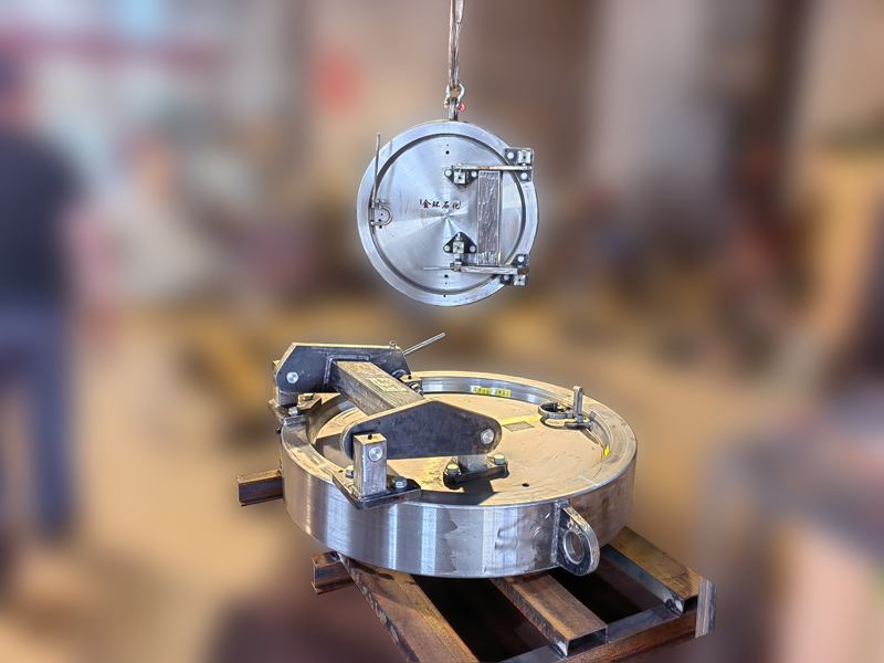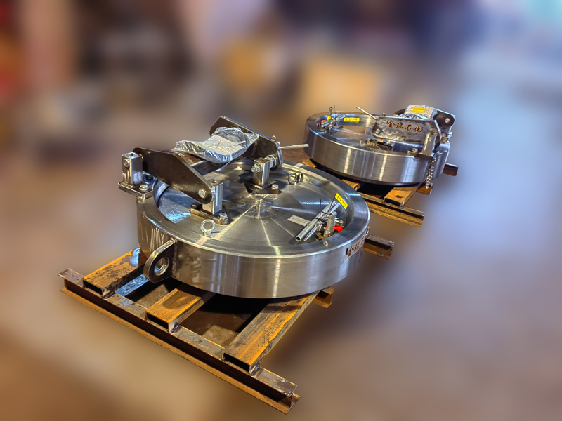 快開盲板是用于壓力管道或壓力容器的圓形開口上的一種機(jī)械裝置。一般由筒體法蘭、頭蓋、勾圈或卡箍、密封圈、安全聯(lián)鎖機(jī)構(gòu)、開閉機(jī)構(gòu)、轉(zhuǎn)臂及短節(jié)(需要時(shí))等部件構(gòu)成。